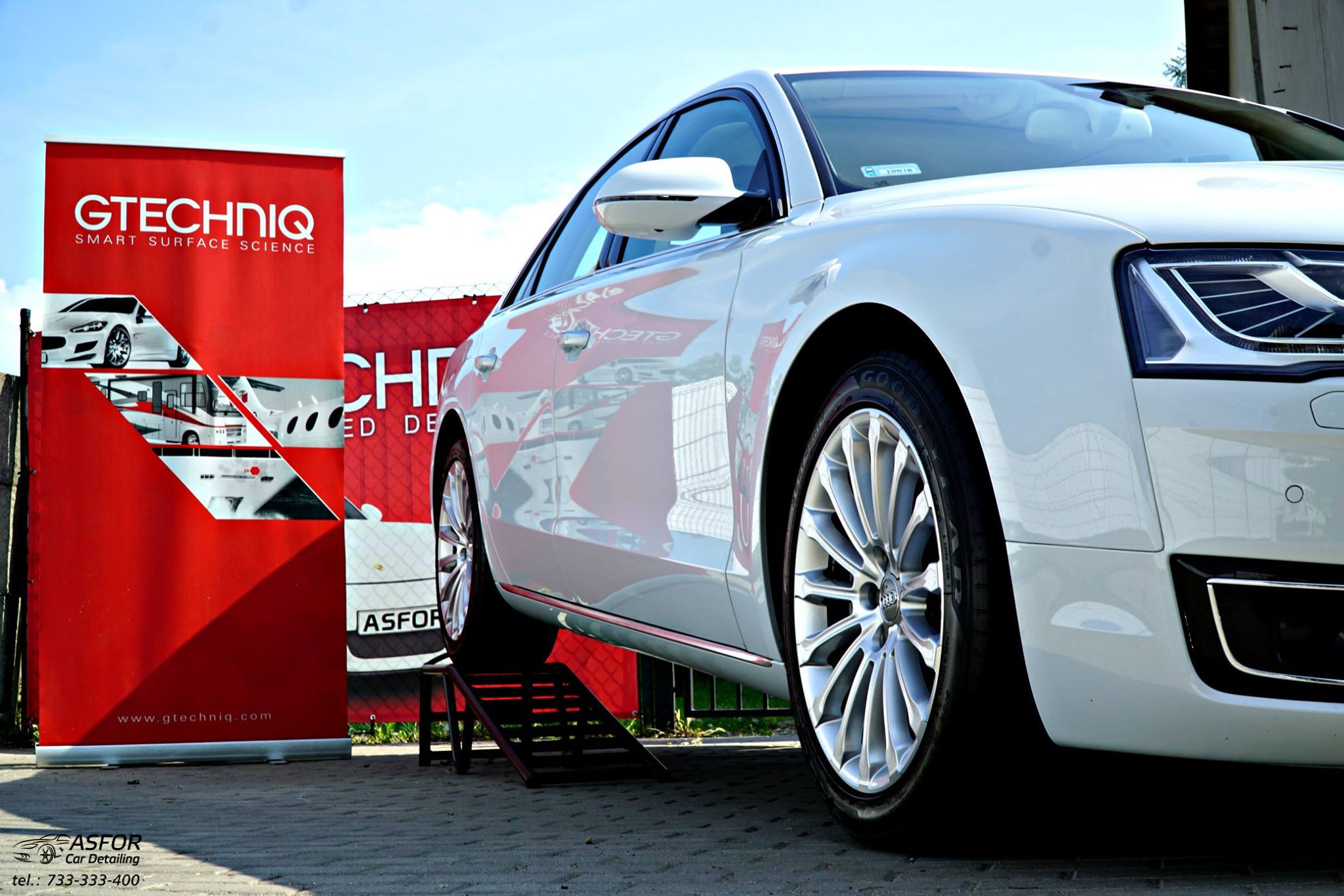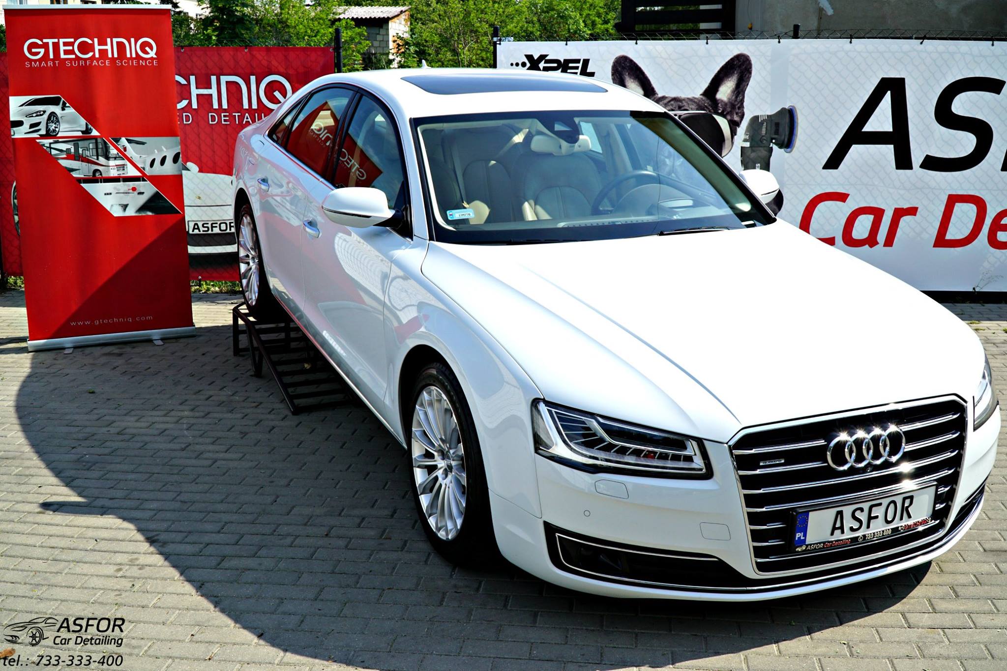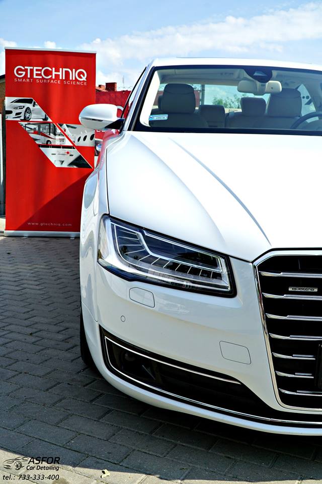 Dwuletnie Audi A8 poddane drobiazgowej kosmetyce: Zaprawki spot/eliminacja odprysków SSR Polska Przygotowanie i wieloetapowa korekta lakieru Zabezpieczone na 5 lat powłoką ceramiczną Crystal Serum Light 9H od Gtechniq Polska Dodatkowa powłoka hydrofobowa EXO V3 odpowiadającą za zdolności samooczyszczania. Wszystkie szyby otrzymały zabezpieczenie G1 Clear Vision. Felgi po dekontaminacji pokryte C5 Whell Armour Kompletny detailing środka w postaci zabezpieczeń większości powieszchni topowymi preparatami od #gtechniq uzupełnił pakiet kosmetyki dla Audi ;)ASFOR Car Detailing/CAR WASH & Detailing Łódź