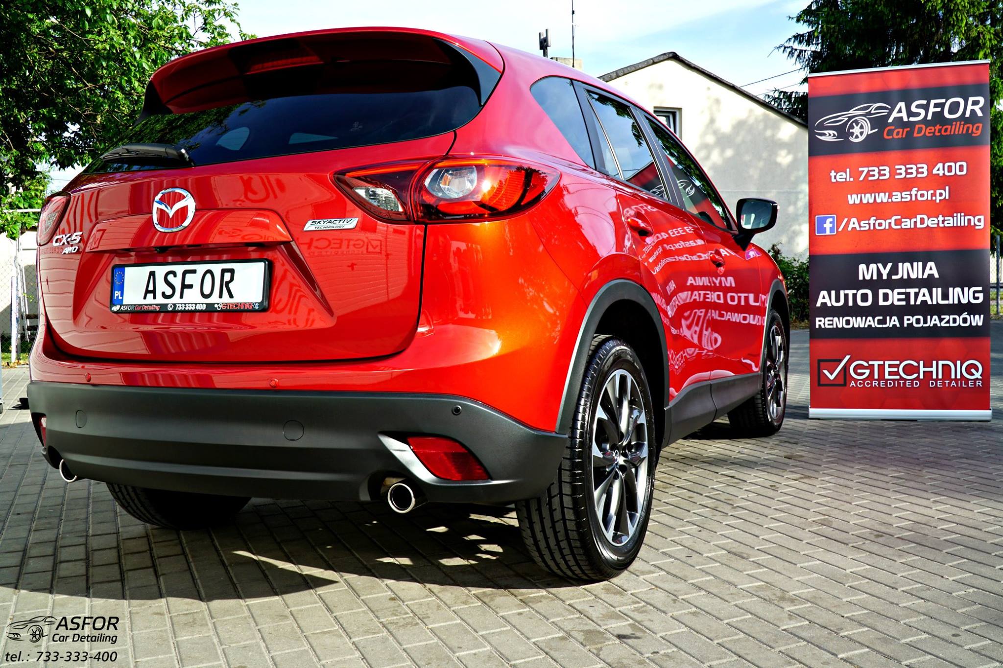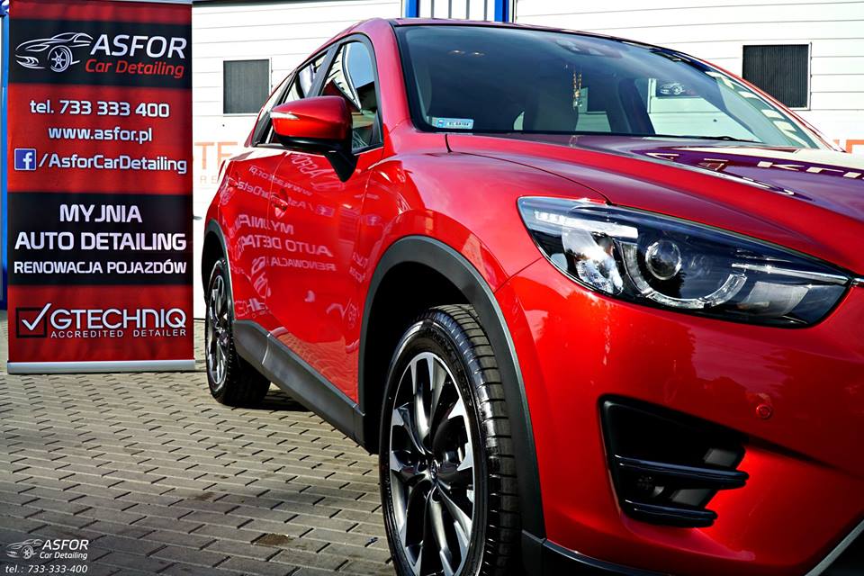 Roczna Mazda CX-5. Poddana odświeżaniu i aplikacji powłoki ceramicznej  Crystal Serum Light 9H  Delikatny lakier Mazdy nabrał szklistej tafli ochronnej na długi czas.. Dodatkowo wykonany kompletny detailing wnętrza pojazdu Zabezpieczone również plastki zewnętrzne i opony