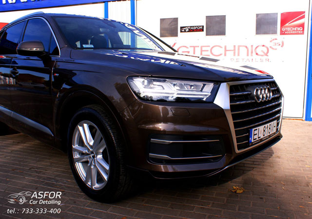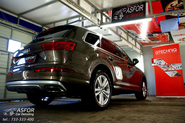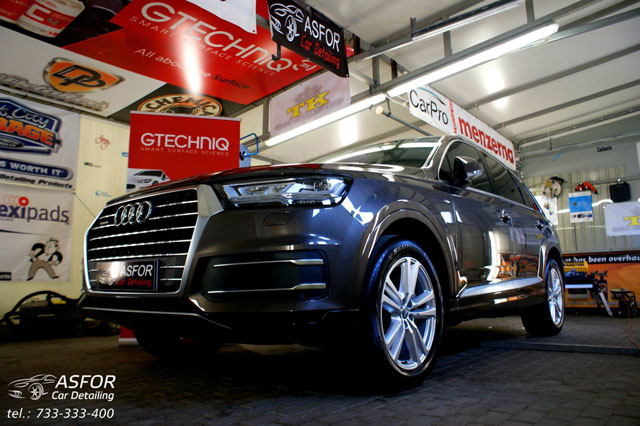 Audi Q7 nowe,zabezpieczone na zewnątrz preparatami od GTECHNIQ.Na wszystkie szyby położona powłoka hydrofobowo-ochronna G1 + G2 Clear Vision.Na lakier zaaplikowana powłoka kwarcowa C1 Crystal Lacquer + dodatkowa powłoka Exo v2a na felgi powłoka kwarcowa C5 Wheel Armour + C2 Liquid Crystal.Drobne elementy plastikowe pokryte C4 Permanent Trim Restorer..:)