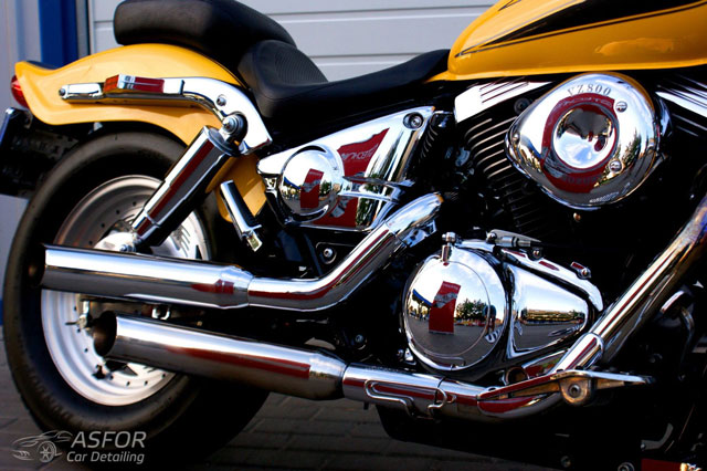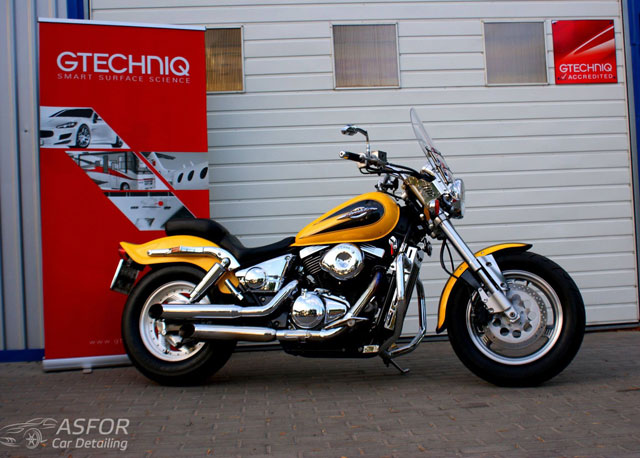 Motocykl sporo doinwestowany jak na ten model-trafił do nas 5 tygodni temu i tak już został w stadzie:)Dekontaminacja dokłanie usunięta ze wszystkich elementów-osłony chłodnicy,pukli śilnika,błotników itp.Elementy lakierowane poddane odświeżeniu i zabezpieczeniu kwarcem od GTECHNIQ C1+C2.Cały napęd motocykla dokładnie wymyty i odtłuszczony-zabezpieczony środkiem smarującym SONAX PTFE.Wszystkie chromy wypolerowane na wysoki połysk z pomocą MOTHERS MAG & MOTHERS BILLET POLISH.Elementy chromowane oprócz tych narażonych na wysoką temperaturę również zabezpieczone powłoką kwarcową C1.Opony zabezpieczone SOFT99 BLACK.Fala zabiegów..taki prezent na 16 urodziny Suzi :)