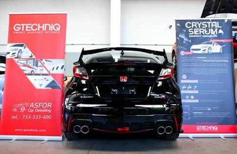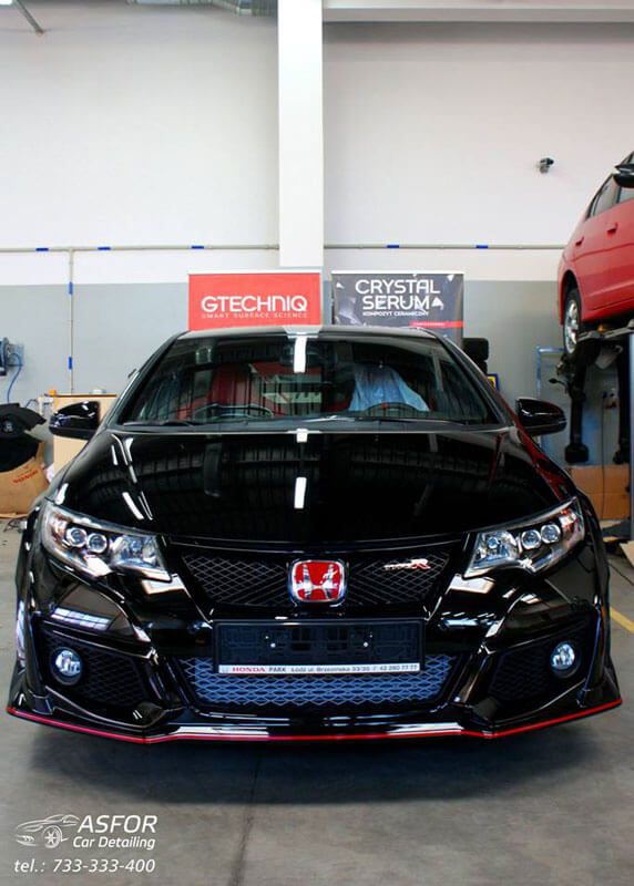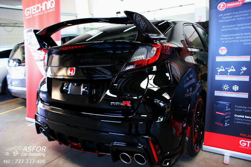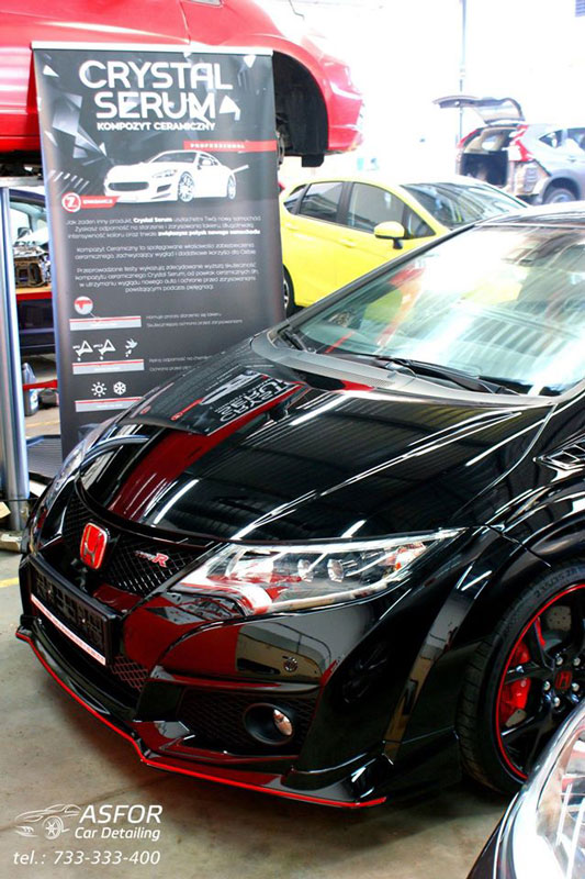 Ostatnio mieliśmy okazje zabezpieczać kolejnego,fabrycznie nowego Typer-a,w salonie Hondy.Czarny lakier poddany aplikacji kompozytu ceramicznego Crystal Serum 7 i 9h-dodatkowo powłoka hydrofobowa Exo v2 od Gtechniq.Wszystkie szyby pokryte G1+G2,felgi nawoskowane Poorboy's World Wheel Sealant.Wyszło genialnie-chyba już bardziej szklić sie nie może, zobaczcie