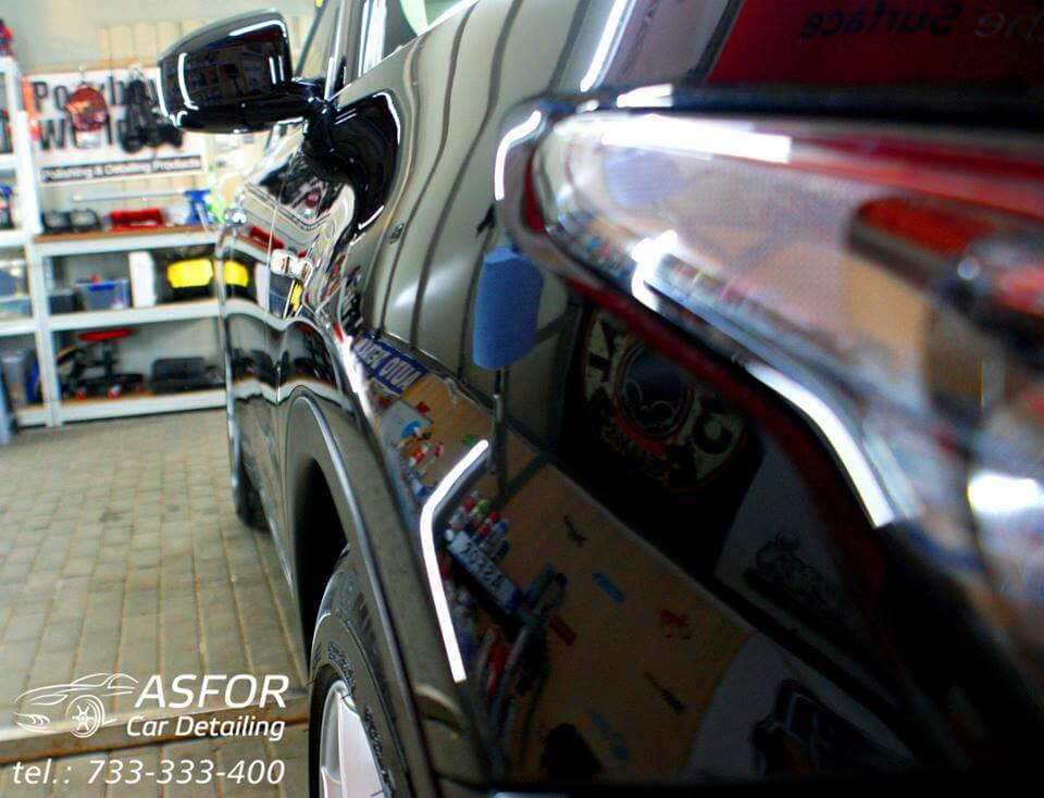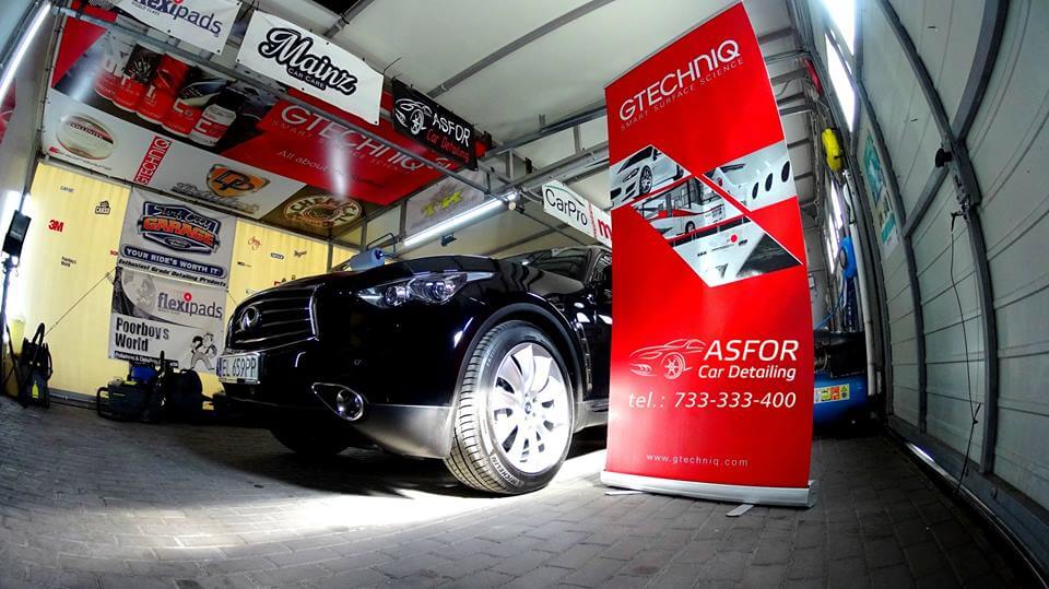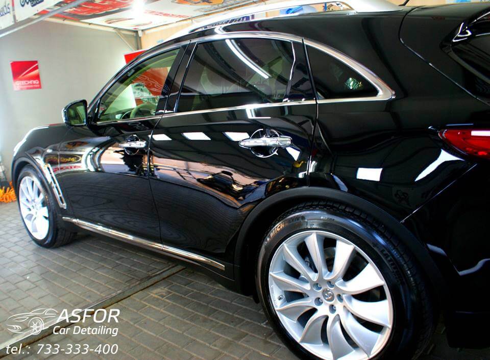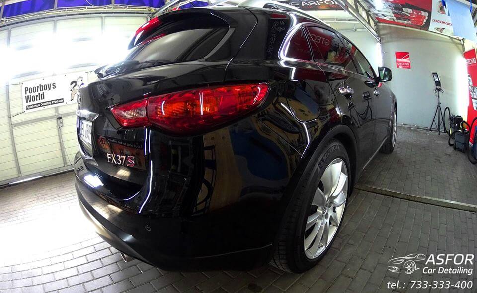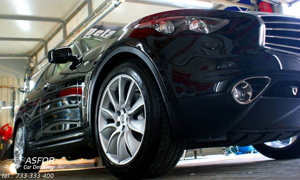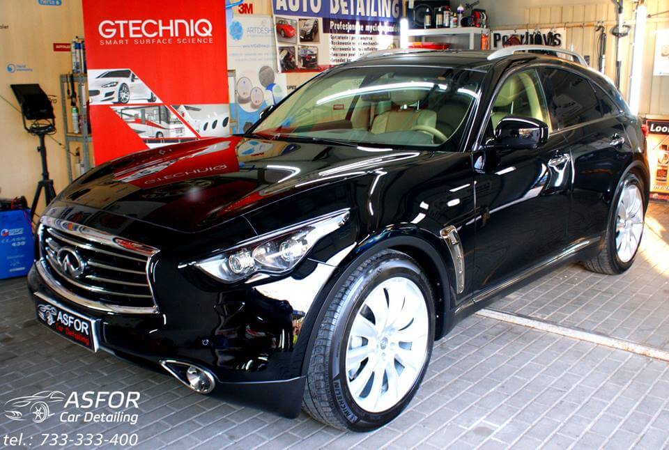 Infinity FX37S.Ten projekt pozostanie na długo w naszej pamięci.Auto gościło u nas aż 15 dni roboczych a i tak do końca nie udało się wykończyć specyficznego lakieru Infinity...Nowa mikrofibra zostawiała hologramy na lakierze.Mimo to się udało-choć trochę to nam zajęło..Najgorsze było to,że wyprowadzony na lustro czarny lakier po inspekcji przyjmował mikrohologramy podczas aplikacji kompozytu ceramicznego Crystal Serum.Było je delikatnie widać w świetle Słonecznym..ponadto w aucie zakwarcowane felgi,lampy tylne,szyby zrobione powłkoką hydrofobową.Wykonany również kompletny valeting środka,wraz z zabezpieczaniem skór i elementów tekstylnych..wyszło fajnie,ale nie idealnie: