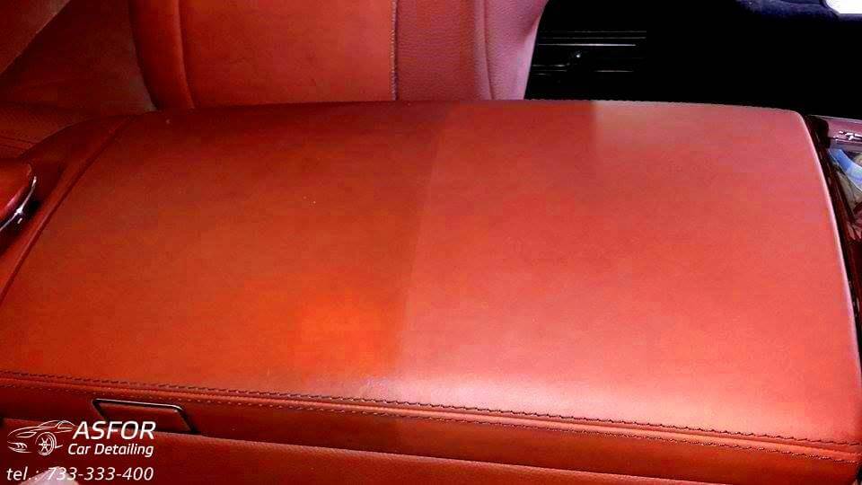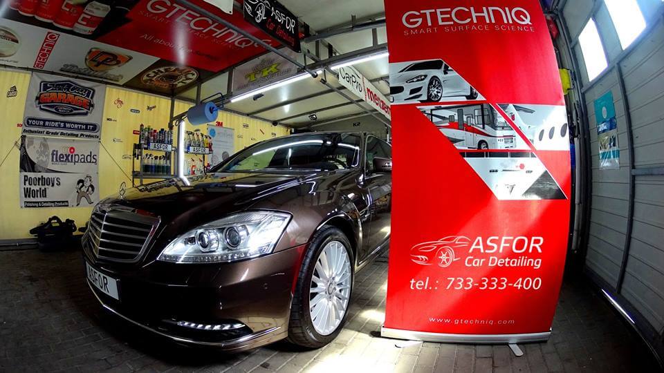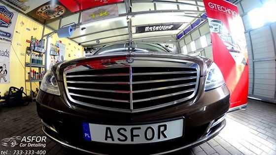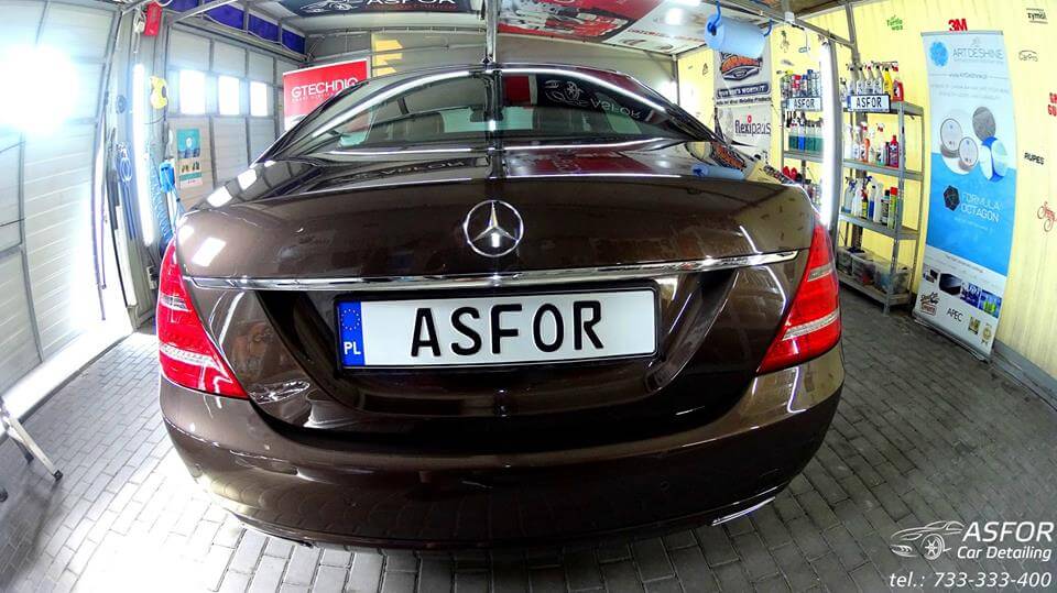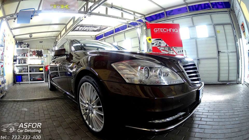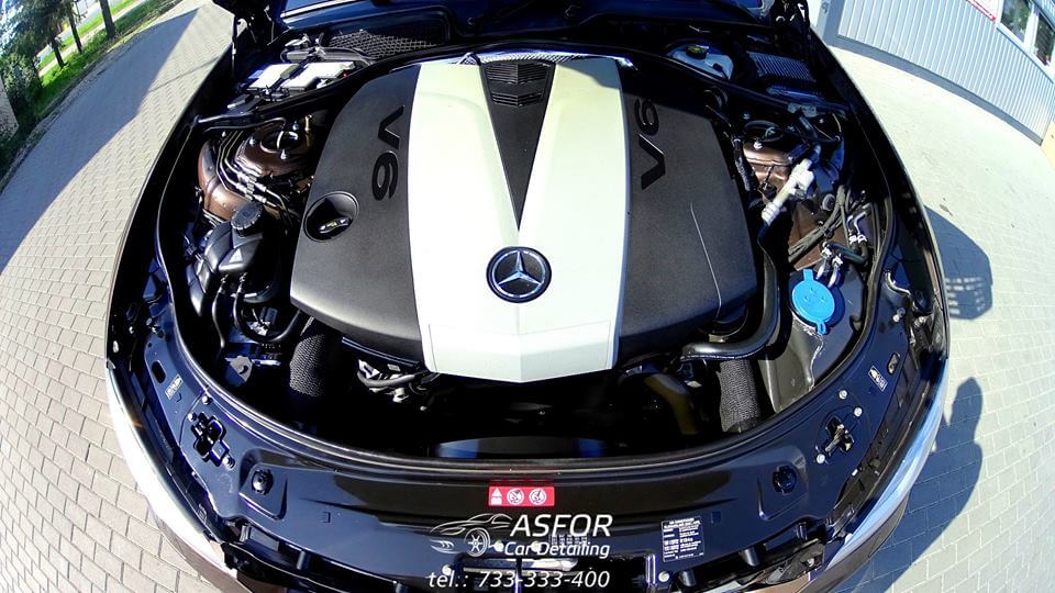 Mercedes S przeszedł u nas: valeting środka wraz z zabezpieczaniem skór i elementów szyba przednia pokryta powłoką hydrofobową G1+G2 detailing komory silnika korekta kloszy lamp tylnych korekta lakieru aplikacja kompozytu ceramicznego na 7 lat Crystal Serum