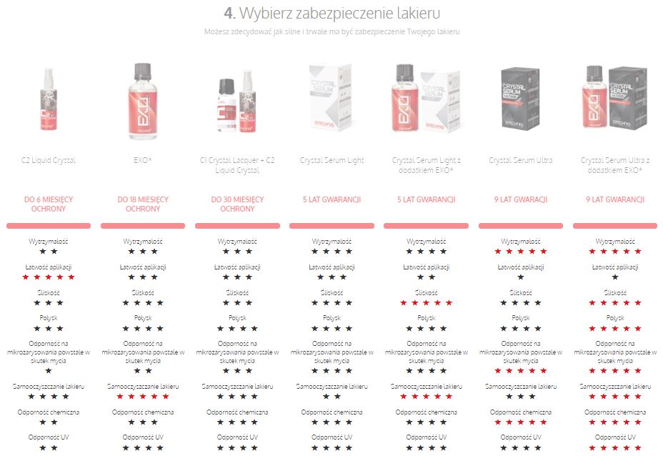 Właściwie dobrane powłoki ochronne stanowią zabezpieczenie lakieru. Ze względu na wyjątkowe właściwości – połysk, twardość i odporność na promieniowanie UV – przede wszystkim polecamy kompozyty ceramiczne. Ich wytrzymałość potwierdzona jest 9-letnią gwarancją.